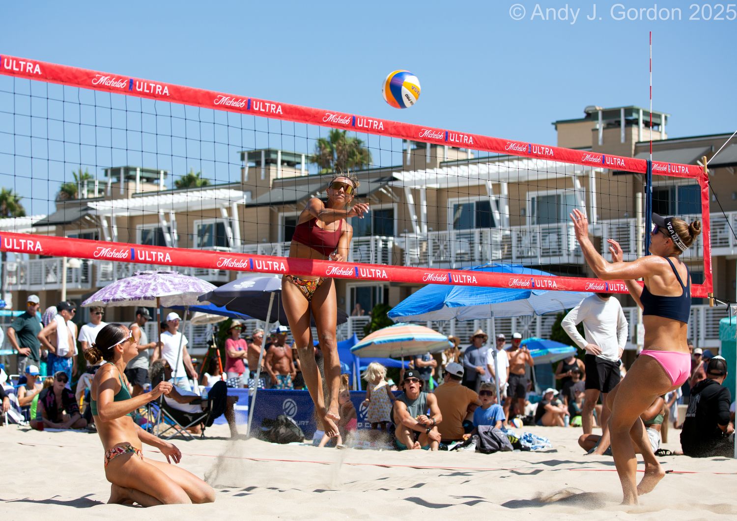 Macy Ludwig hitting over Morgan Chacon at Hermosa Open 2025. Andy J. Gordon photo.