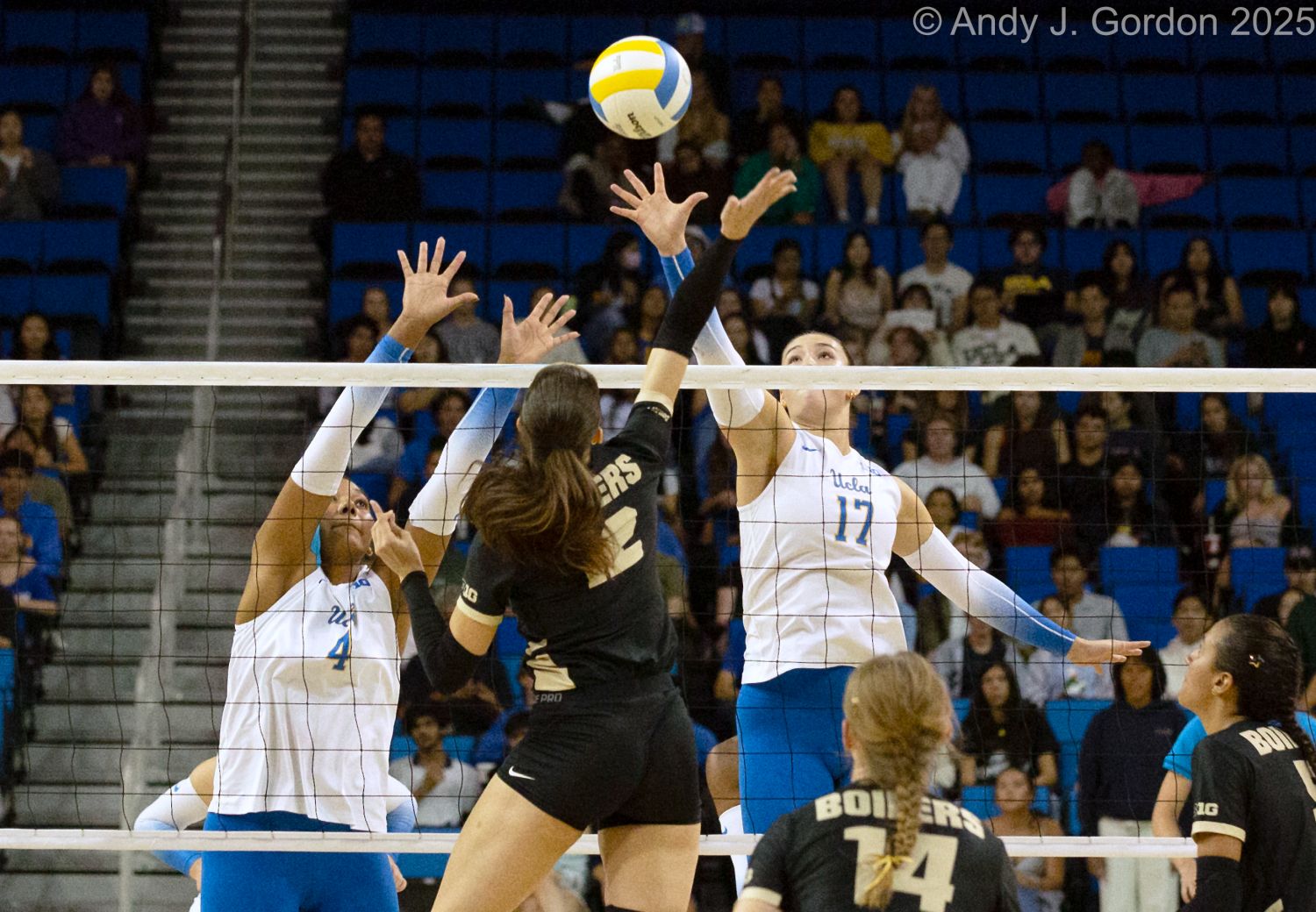 Kenna Wollard hitting for Purdue vs the UCLA block by Marianna Singletary and Anastasija Ivkovic during women’s volleyball vs Purdue at Pauley Pavilion on Oct 2, 2025. Photo by Andy J. Gordon