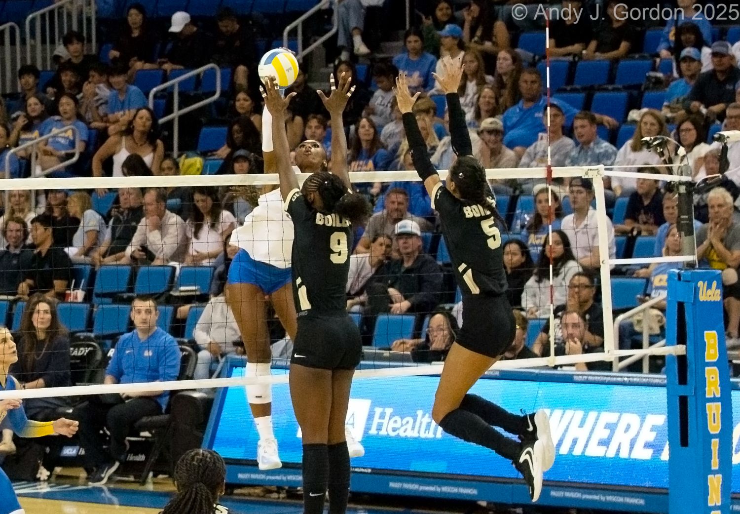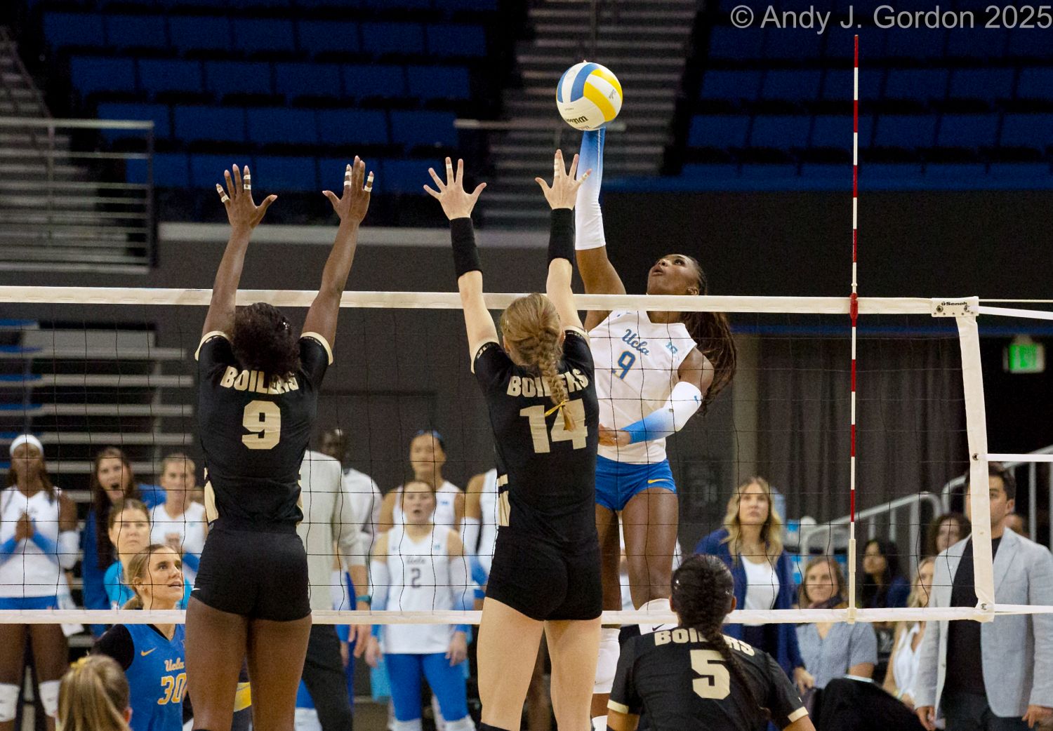 Cheridyn Leverette hitting for UCLA vs the Purdue block by Dior Charles and Taylor Anderson during women’s volleyball vs Purdue at Pauley Pavilion on Oct 2, 2025. Photo by Andy J. Gordon