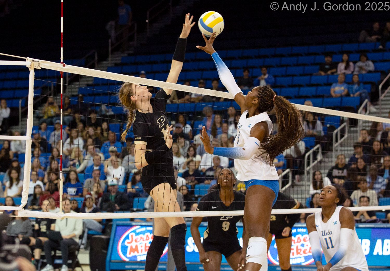 Cheridyn Leverette hitting for UCLA vs the Purdue block by Grace Heaney and Lindsey Miller during women’s volleyball vs Purdue at Pauley Pavilion on Oct 2, 2025. Photo by Andy J. Gordon